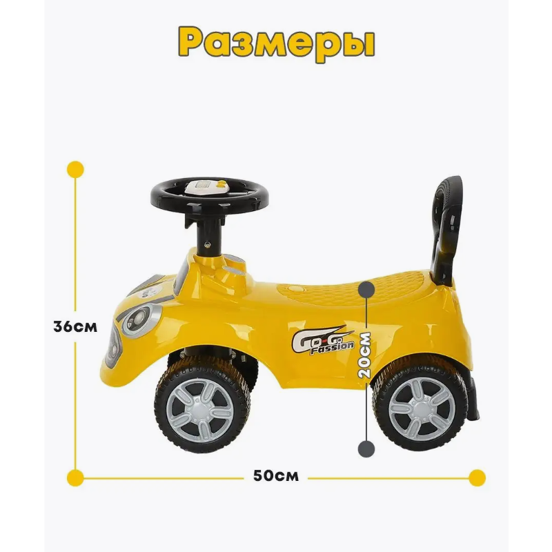 Каталка миникар порадует вашего ребенка поворотным рулем, на котором располагаются кнопки со звуками.